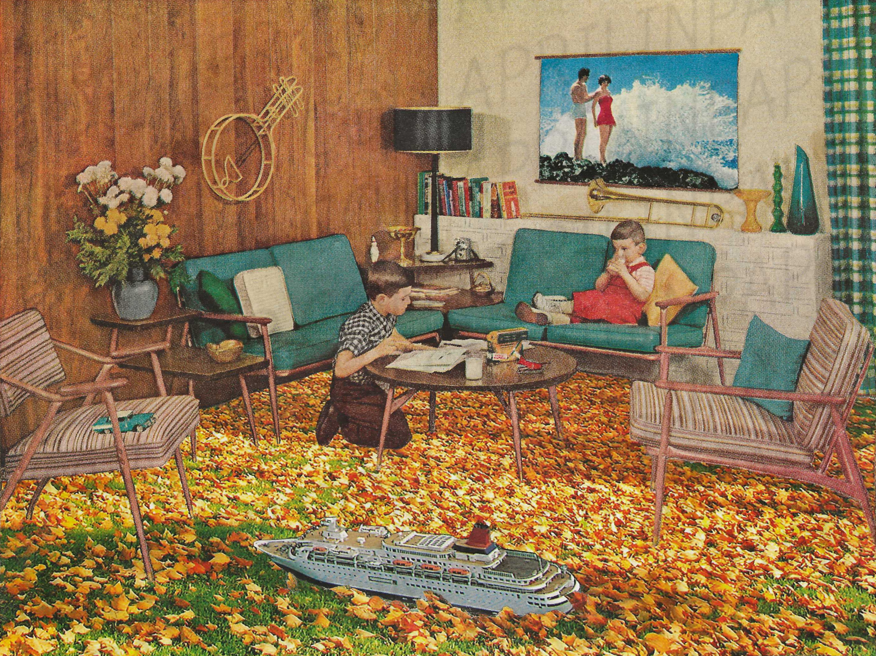 A cozy mid-century living room transforms into a surreal autumn wonderland in Autumn Voyage. Fallen leaves carpet the floor as a young boy diligently works on his homework, while his younger brother, nestled on the couch, watches a cruise ship drift through the golden foliage. A playful blend of nostalgia, imagination, and seasonal warmth.