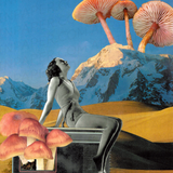 Escape into a dreamlike world where vintage nostalgia meets surreal imagination. This print of a one-of-a-kind hand-cut paper collage features a reclining vintage woman atop an oversized retro radio, surrounded by giant mushrooms and a serene mountain landscape.