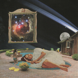Ever feel like you just need a nap… in a pool… under a galaxy? Same.In this dreamy hand-cut collage, a giant woman catches some cosmic Z’s in a pool while her normal-sized friend debates joining her. Overhead, the night sky casually shows off with a framed galaxy—because, why not?